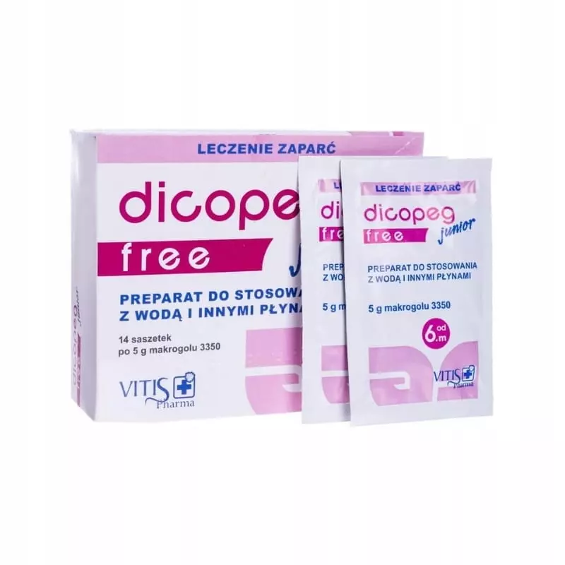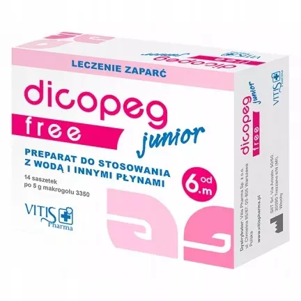 Wskazania: Dicopeg Junior Free to wyrób medyczny w postaci proszku do sporządzania roztworu doustnego, zalecany w leczeniu przewlekłych zaparć u dzieci. Można go również stosować w sporadycznych przypadkach nieregularnej pracy jelit. Preparat zmiękcza stolec, ułatwiając wypróżnianie, nie powodując przy tym skurczów, bólów brzucha ani nagłego parcia. Przeznaczony dla niemowląt od 6. miesiąca życia i dzieci.