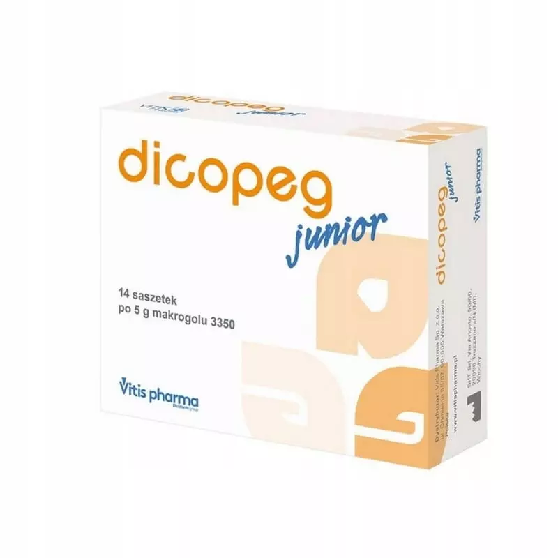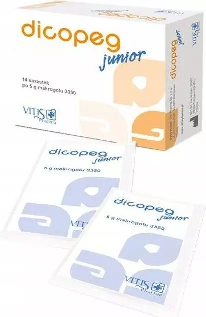 Dicopeg Junior - produkt medyczny dla dzieci ułatwiający wypróżnianie, 14 saszetek. Dicopeg Junior, saszetki Wyrób medyczny. Wykazuje osmotyczne działanie przeczyszczające, dzięki czemu reguluje pracę jelit w sposób naturalny. Nie wchłania się i nie ulega fermentacji w jelitach. Nie podrażnia błony śluzowej. Jest wydalany z kałem w niezmienionej formie. Do stosowania już od 6. miesiąca życia. Bez glutenu. Skład: makrogol 3350, dwutlenek krzemu, aromat, sól sodowa sacharyny. Wskazania: Dicopeg Junior jest szczególnie zalecany w przypadku przewlekłych zaparć oraz w przypadku sporadycznych zaburzeń pracy jelit. Właściwości: Dicopeg Junior dzięki właściwościom hydrofilowym zmiękcza stolec i ułatwia wypróżnienie, przy czym nie powoduje skurczów, bólów brzucha ani nagłego parcia. skuteczność nie zmniejsza się z upływem czasu. Stosowanie: Od 6 miesiąca życia do 2 lat (do 12 kg): 1-2 saszetki dziennie Od 2 do 11 roku życia (od 12 kg do 20 kg): 2-4 saszetki dziennie Powyżej 11 roku życia (lub > 20 kg): 2-6 saszetek dziennie Dawkę można zwiększyć lub zmniejszyć w zależności od indywidualnej reakcji pacjenta nauczenie. Zaleca się w tym celu skonsultować z lekarzem. Przed podawaniem produktu małym dzieciom należy zawsze skonsultować się z lekarzem. Zazwyczaj największa potrzebna dawka dzienna nie przekracza 6 saszetek. Rozpuścić zawartość saszetki w 1/2 szklanki wody (62,5 ml) i wypić sporządzony roztwór. Dawkę dzienną można zażywać w kilku podaniach. Można rozpuścić wszystkie saszetki przewidziane na dany dzień w odpowiedniej ilości wody i wstawić roztwór w zamkniętym pojemniku do lodówki na okres nie dłuższy niż 24 godziny. Zaleca się zażywać Dicopeg Junior w długich odstępach czasu od posiłków. Stosowanie z innymi lekami: Zaleca się zażywanie Dicopeg Junior w odstępie co najmniej 2 godzin od zażycia innych leków doustnych, ponieważ działanie osmotyczne makrogolu oraz przyspieszenie pasażu jelitowego mogą zmniejszyć ich skuteczność. Stosowanie z jedzeniem: Zaleca się zażywać Dicopeg Junior w długich odstępach czasu od posiłków. Przeciwwskazania: Nie stosować w przypadku nadwrażliwości na makrogol. Nie stosować w przypadku: perforacji i/lub niedrożności układu pokarmowego, zmian chorobowych układu pokarmowego lub wvdalniczego, poważnych chorób zapalnych jelit, takich jak choroba Leśniewskiego-Crohna lub wrzodziejące zapalenie jelita grubego, ostre rozdęcie okrężnicy. Przechowywać w temperaturze nieprzekraczającej 25oC. Przechowywać w sposób niedostępny dla dzieci. TO JEST WYRÓB MEDYCZNY. UŻYWAJ GO ZGODNIE Z INSTRUKCJĄ UŻYTKOWANIA LUB ETYKIETĄ. PRODUKT ZAWIERA INSTRUKCJĘ I ETYKIETĘ W JĘZYKU POLSKIM. PRODUKT OZNAKOWANY ZNAKIEM CE. POSIADA DEKLARACJĘ ZGODNOŚCI Z EUROPEJSKIMI PRZEPISAMI DOTYCZĄCYMI WYROBÓW MEDYCZNYCH. Ważne! Informacje dotyczące suplementu: Nie należy przekraczać dziennej zalecanej porcji do spożycia. Suplementy diety nie mogą być stosowane jako substytut (zamiennik) zróżnicowanej diety. Utrzymanie prawidłowego stanu zdrowia wymaga zrównoważonego odżywiania i prowadzenia zdrowego trybu życia. Przechowywać w suchym i chłodnym miejscu, niedostępnym dla małych dzieci.