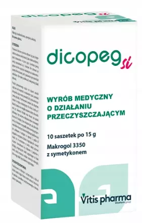 Dicopeg si jest wyrobem medycznym przeznaczonym do objawowego leczenia zaparcia. Wspomaga perystaltykę, ułatwia odpowiednie opróżnianie jelit, przeciwdziałając w ten sposób zaparciu i zapobiegając tworzeniu się zbitych mas kałowych. Ułatwia również eliminację gazów jelitowych, zmniejszając uczucie wzdęcia i rozdęcia jamy brzusznej.
