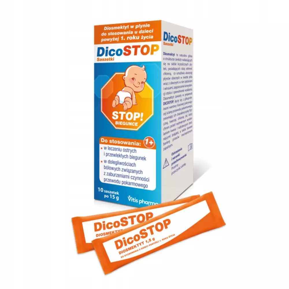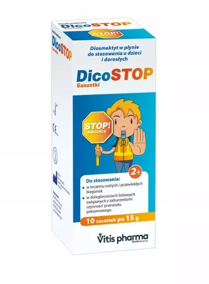 Wskazania DicoStop: Leczenie ostrych i przewlekłych biegunek. Właściwości: Płynny wyrób medyczny w saszetce, do jednorazowego użytku, wskazany w doustnym leczeniu ostrych i przewlekłych biegunek i dolegliwości bólowych związanych z zaburzeniami czynności przewodu pokarmowego. Diosmektyt zawarty w preparacie DICOSTOP łączy się z glikoproteinami warstwy śluzowej pokrywającej ścianę przewodu pokarmowego, zmieniając ich charakterystykę fizyczną, tworząc chłonny żel, który chroni przed nadmiernym wydzielaniem kwasu i substancjami drażniącymi żołądek, a także stanowi barierę przeciw mechanizmom zapalnym. Skład: Jedna saszetka DICOSTOP zawiera: Składnik aktywny: diosmektyt (1,5 g). Substancje pomocnicze: woda oczyszczona, EDTA, guma karaya, metyloparaben sodowy, estry sacharozy i kwasów tłuszczowych, aromaty, kwas cytrynowy, benzoesan sodowy, sukraloza. Dawkowanie: Dorośli: 1 saszetka 3 razy dziennie Dzieci w wieku 6-12 lat: 1 saszetka 2-3 razy dziennie Dzieci w wieku 2-6 lat: 1 saszetka 1-2 razy dziennie Każda saszetka może być użyta tylko raz po jej otwarciu. Energicznie ugnieść zawartość saszetki przed jej otwarciem. Produkt może być przyjmowany bezpośrednio lub rozpuszczony w szklance wody lub w innych napojach (sok, jogurt). Po otwarciu, zawartość saszetki powinna być przyjęta w całości, produkt jest jednorazowego użycia. Wszelkie pozostałości roztworu nie mogą być przyjęte później w ciągu dnia. W przypadku małych dzieci, zawartość saszetki można podać w butelce do karmienia, po zmieszaniu z 50 ml wody lub innego napoju, podzieloną na 2-3 dawki w ciągu dnia. Możliwe jest także dodanie preparatu DICOSTOP do pokarmów półpłynnych. Doradza się przyjmowanie preparatu DICOSTOP pomiędzy posiłkami. W leczeniu ostrej biegunki należy stosować doustny płyn nawadniający (DPN) w celu uniknięcia odwodnienia. Ważne informacje: Uwaga! To jest wyrób medyczny. Używaj go zgodnie z instrukcją używania lub etykietą. Wyrób medyczny posiada oznaczenie CE 0426 Produkt posiada etykietę, instrukcję obsługi sporządzone w języku polskim. Produkt posiada deklarację zgodności z normami UE. Nie stosować wyrobu medycznego u dzieci przed ukończeniem drugiego roku życia. Nie stosować wyrobu w przypadku znanej nadwrażliwości na składniki tego wyrobu medycznego. Nie stosować wyrobu medycznego u kobiet w ciąży i podczas karmienia piersią. DICOSTOP nie powinien być stosowany po dacie ważności podanej na opakowaniu. DICOSTOP należy przechowywać w temperaturze pokojowej (15-25°C); unikać ekspozycji na bezpośrednie źródła światła, ciepło i nadmierną wilgotność. Opakowanie: 10 saszetek po 15 gram