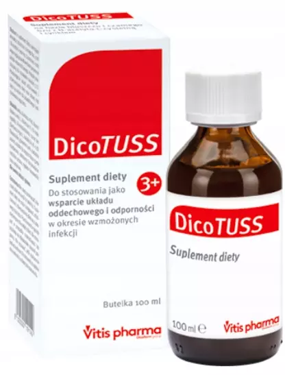 Dicotuss to suplement diety zawierający ekstrakty z bluszczu i czarnego bzu, cynk i N-acetylo-L-cysteinę. Czarny bez i cynk wspomagają prawidłowe funkcjonowanie układu odpornościowego. Rośliny, z których ekstrakty są zawarte w Dicotuss, czyli bluszcz i czarny bez, były starannie wyselekcjonowane pod kątem bezpieczeństwa i jakości oraz analizowane zgodnie z najbardziej zaawansowanymi metodami, zapewniającymi brak niebezpiecznych zanieczyszczeń i optymalną ilość komponentów aktywnych, aby zapewnić skuteczność produktu.