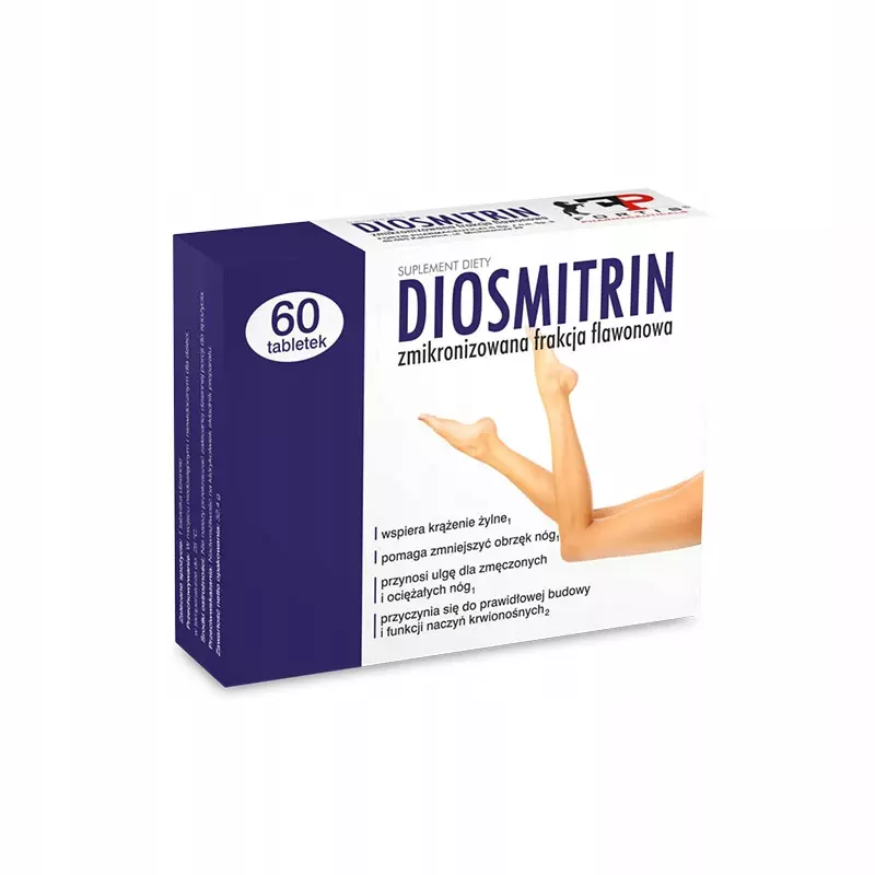 Diosmitrin, suplement diety w postaci tabletek. Zawarty wyciąg z ruszczyka kolczastego wpływa na wzmocnienie napięcia ścian naczyń krwionośnych, przez co pomaga zmniejszyć obrzęk nóg. Ruszczyk wspiera krążenie żylne oraz przynosi ulgę dla zmęczonych i ociężałych nóg. Witamina C przyczynia się do wzmocnienia głównie małych naczyń krwionośnych, wpływając korzystnie na ich budowę oraz funkcje.
