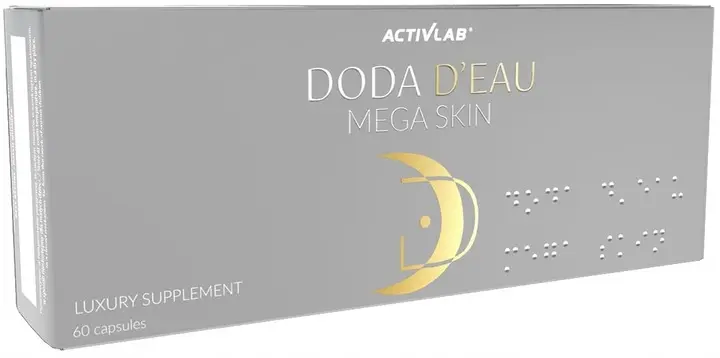 ACTIVLAB DODA D'EAU Mega Skin to suplement diety, który powstał wraz ze współpracą z Dodą. Jego skład oparty jest o olej z wiesiołka, kwas gamma-linolenowy (GLA) oraz witamine E, zamknięte w kapsułkach łatwych do połknięcia. Zastosowany olej z wiesiołka jest nierafinowany i niefiltrowany, dzięki czemu ma dużo prozdrowotnych właściwości oraz zawiera duże ilości witaminy E, F i kwasów tłuszczowych nienasyconych. Olejek z wiesiołka chroni przed utratą wilgoci i wspiera naturalną barierę ochronną skóry. Łagodzi nierówności i wspomaga regenerację skóry. Oddziałuje także na utrzymanie prawidłowego nawilżenia naskórka, zmniejszając nieprzyjemne uczucia ściągnięcia. Jest bardzo pomocny dla cery dojrzałej, która często jest bardziej odwodniona, cieńsza, mało sprężysta i elastyczna.