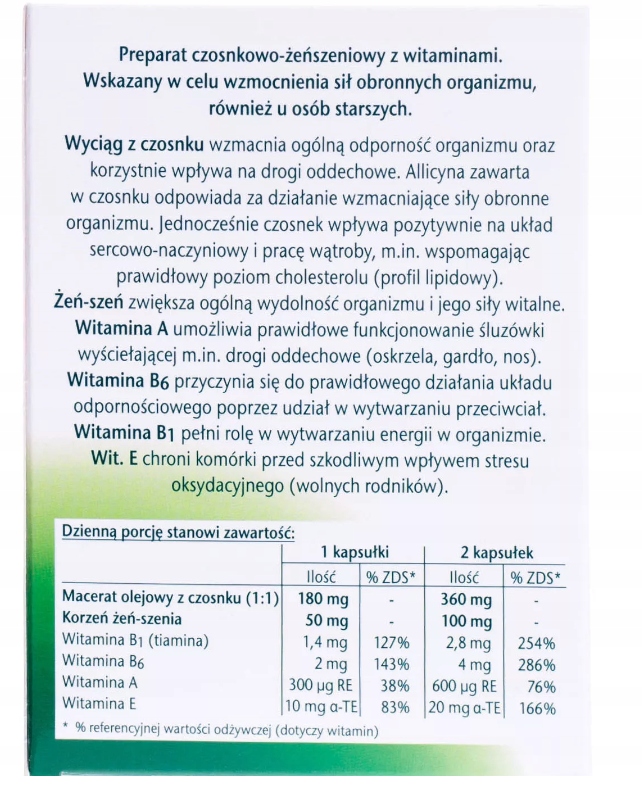 Macerat olejowy z czosnku (1:1), korzeń żeń-szenia (Panax C.A. Meyer); witaminy: chlorowodorek pirydoksyny (witamina B6), monoazotan tiaminy (witamina B1), palmitynian retinylu (witamina A), octan DL-alfa-tokoferylu (witamina E) oraz substancje dodatkowe: olej sojowy i lecytyna sojowa, dwutlenek krzemu (substancja wypełniająca); składniki otoczki: żelatyna, glicerol (subst. utrzymująca wilgotność), karmel E 150 d (barwnik).