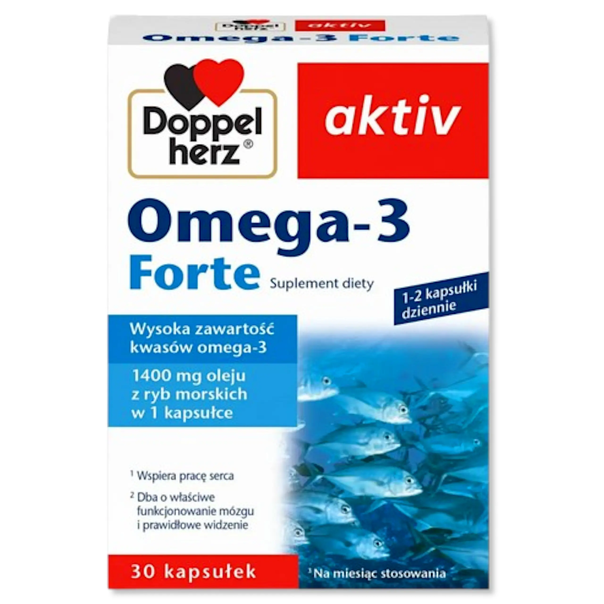 Suplement diety Doppelherz aktiv Omega-3 Forte polecany dla osób dorosłych w celu uzupełnienia diety w kwasy EPA i DHA.