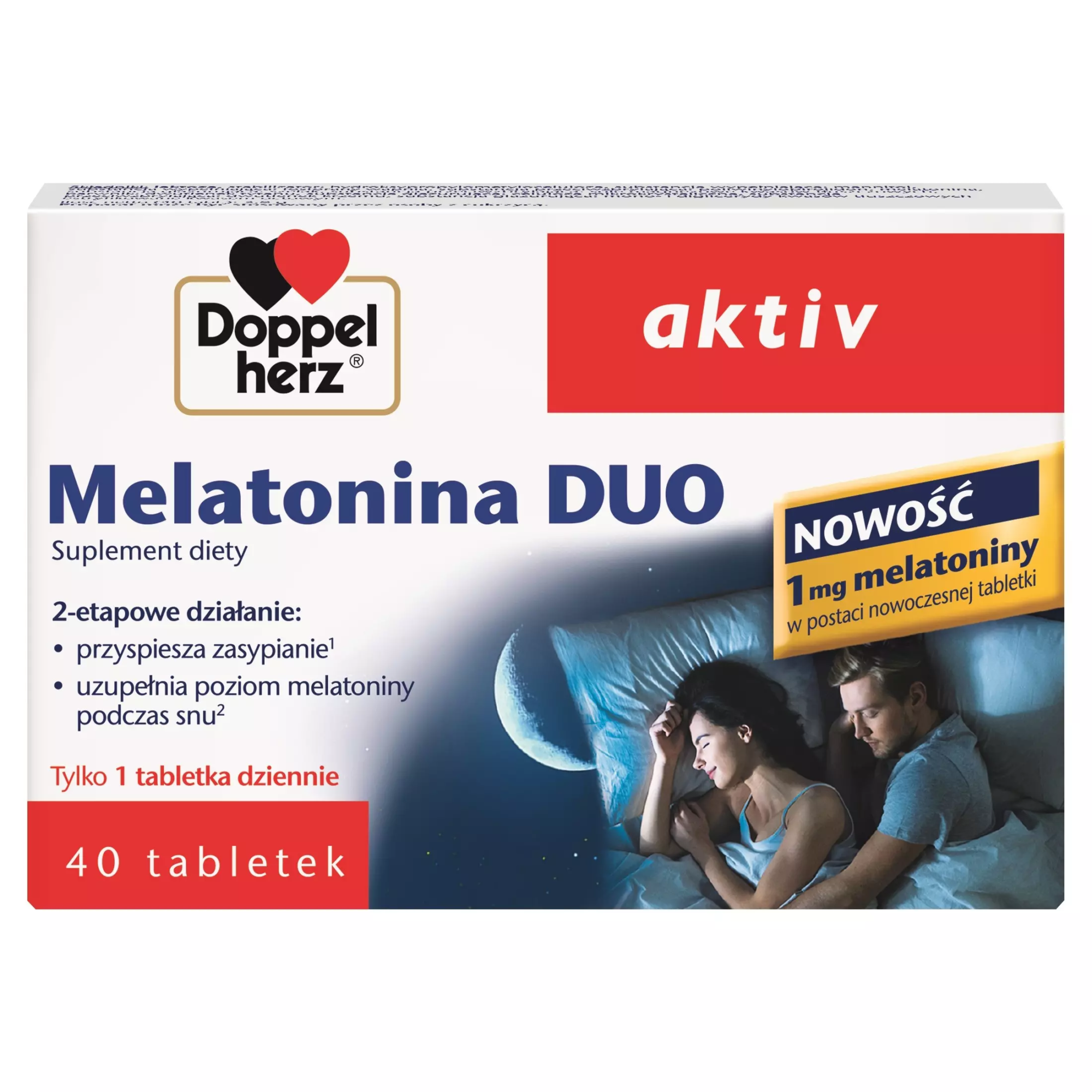DoppelHerz Aktiv Melatonina Duo to suplement diety, który zawiera 1 mg melatoniny w postaci nowoczesnej dwufazowej tabletki. Dwuwarstwowa budowa tabletki zapewnia uwalnianie substancji aktywnej w dwóch fazach.