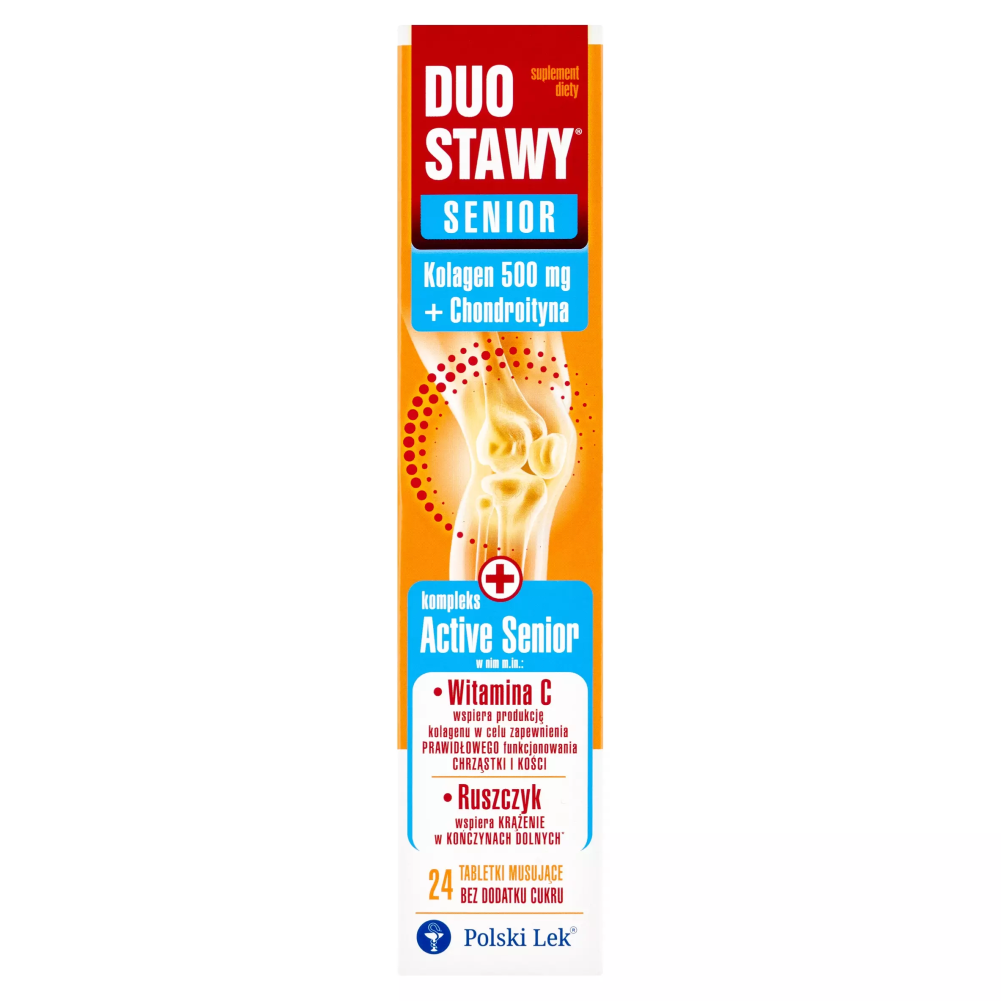 Duo Stawy Senior to suplement diety w postaci tabletek musujących o smaku cytrynowym, zawierający kolagen, chondroitynę oraz kompleks Active Senior z witaminą C, witaminą B6, tiaminą i ekstraktem z korzenia ruszczyka kolczastego. Preparat przeznaczony dla osób dorosłych, wspomaga zdrowie stawów oraz metabolizm energetyczny.