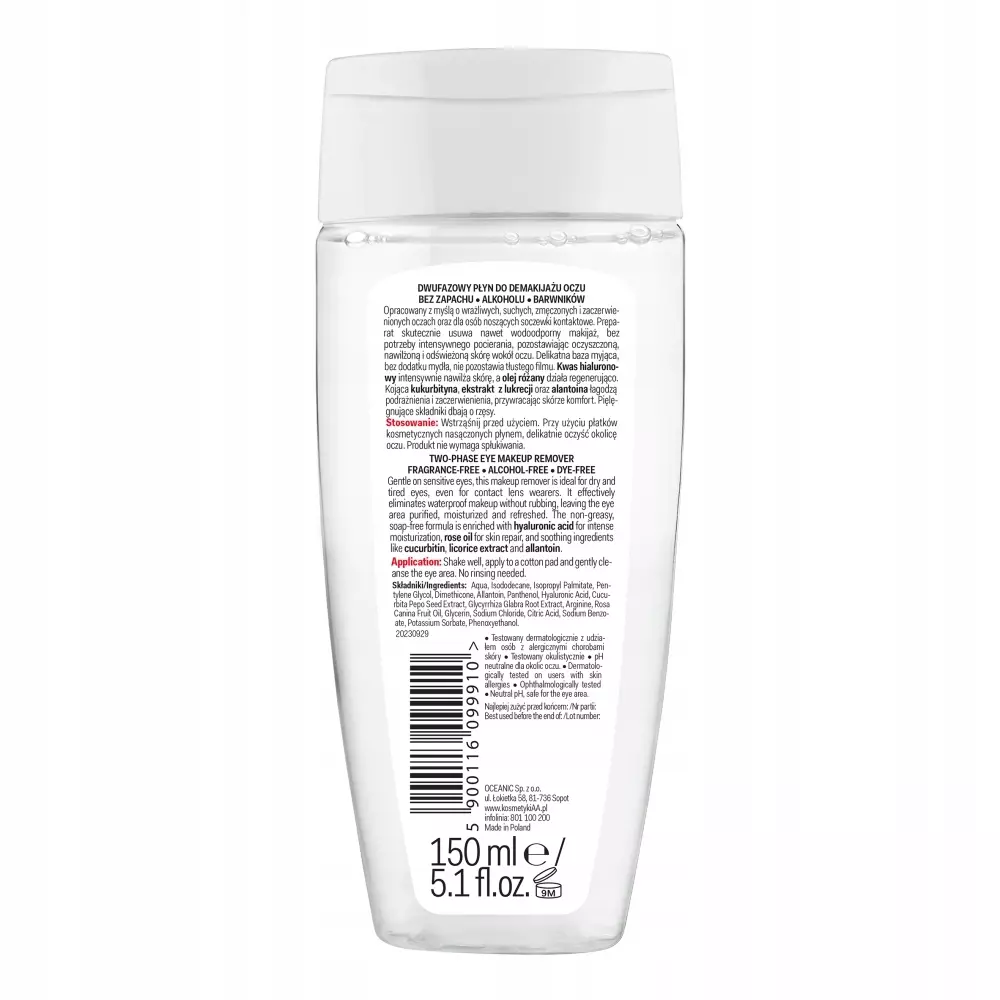 Dwufazowy płyn do demakijażu oczu został opracowany z myślą o wrażliwych, suchych, zmęczonych i zaczerwienionych oczach oraz dla osób noszących soczewki kontaktowe. Preparat skutecznie usuwa nawet wodoodporny makijaż, bez potrzeby intensywnego pocierania, pozostawiając oczyszczoną, nawilżoną i odświeżoną skórę wokół oczu. Delikatna baza myjąca, bez dodatku mydła, nie pozostawia tłustego filmu.Zawiera składniki pielęgnujące rzęsy.BEZ ZAPACHU • ALKOHOLU • BARWNIKÓWStosowanie: Wstrząśnij przed użyciem. Przy użyciu płatków kosmetycznych nasączonych płynem, delikatnie oczyść okolice oczu. Produkt nie wymaga spłukiwania.