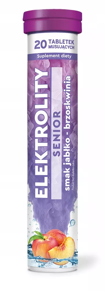 ELEKTROLITY SENIOR to suplement diety o smaku jabłkowo-brzoskwiniowym zawierający w swoim składzie elektrolity: sód, potas, magnez i chlorek, a także witaminę C oraz ekstrakt z pestek winogron.