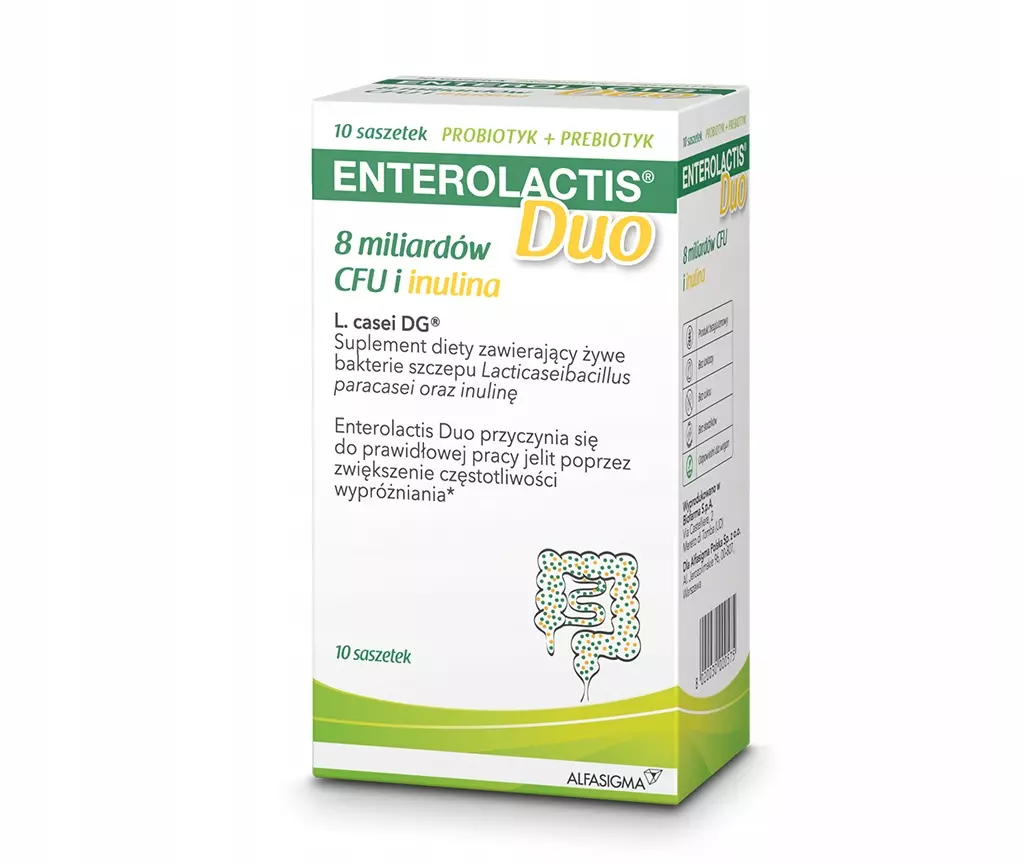 ENTEROLACTIS® Duo to suplement diety zawierający żywe bakterie szczepu L. casei DG® (Lacticaseibacillus paracasei DG® I-1572, DSM 34154), odpowiednio dobrany pod kątem uzupełniania mikroflory jelit oraz prebiotyk inulinę.