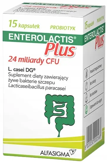RODZAJ REJESTRACJI: Suplement diety PRODUCENT: Alfasigma Polska ADRES PRODUCENTA: Al. Jerozolimskie 96, 00-807 WARSZAWA ILOŚĆ: 15 kapsułek OPIS: ENTEROLACTIS® Plus zawiera żywe bakterie szczepu L. casei DG® (Lacticaseibacillus paracasei DG® I-1572, DSM 34154). Szczep ten charakteryzuje się dużą przeżywalnością oraz przyczepnością (adhezją) do komórek błony śluzowej jelit. Dzięki tym właściwościom przechodzi bez uszkodzenia przez pierwszy odcinek przewodu pokarmowego i dociera do okrężnicy, gdzie wspomaga wzrost innych bakterii. Takie działanie sprawia, że L. casei DG® wpływa na mikrobiotę jelitową, zwiększając liczbę zdrowych bakterii, a zmniejszając ilość chorobotwórczych drobnoustrojów. L. casei DG® (Lacticaseibacillus paracasei DG® I-1572, DSM 34154) to unikatowy, opatentowany szczep bakterii, który jest zdeponowany w Instytucie Pasteura w Paryżu w CNCM (Colletion National de Cultures de Microorganismes) pod numerem CNCM I-1572. ENTEROLACTIS® Plus może być stosowany u dorosłych i dzieci powyżej 6 roku życia: w trakcie i po antybiotykoterapii podczas leczenia biegunek wirusowych i bakteryjnych w odbudowie fizjologicznej mikroflory jelitowej ww wzmocnieniu odporności Produkt nie zawiera glutenu i laktozy, odpowiedni dla wegan. SPOSÓB UŻYCIA: Dorośli i dzieci powyżej 6 roku życia: 1 kapsułka dziennie, popijając wodą, najlepiej na pusty żołądek. W przypadku jednoczesnego stosowania terapii antybiotykowej, Enterolactis należy przyjąć co najmniej 3 godziny po antybiotyku. OSTRZEŻENIA: Suplement diety nie może być stosowany jako substytut zróżnicowanej diety.Należy stosować zbilansowaną i zróżnicowaną dietę oraz prowadzić zdrowy tryb życia. Nie należy przekraczać porcji zalecanej do spożycia w ciągu dnia; nie stosować w przypadku uczulenia na którykolwiek składnik preparatu. SKŁAD: L. casei DG® (Lacticaseibacillus paracasei DG® I-1572, DSM 34154), nie mniej niż 24 miliardy CFU, hydroksypropylometyloceluloza (otoczka kapsułki), barwnik: węglan wapnia (E170), substancje przeciwzbrylające: dwutlenek krzemu; sole magnezowe kwasów tłuszczowych.