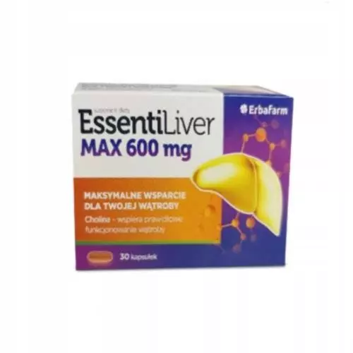 EssentiLiver Max 600 to suplement diety w postaci kapsułki miękkiej, zawierający fosfolipidy sojowe (w tym fosfatydylocholinę i cholinę).