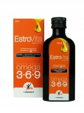 Nasz organizm codziennie wystawiany jest na wiele prób. Walczy z niekorzystnymi warunkami i czynnikami zewnętrznymi, mierzy się z atakującymi go bakteriami czy wirusami oraz często towarzyszącym nam stresem. Właśnie dlatego tak ważne jest wsparcie organizmu. W trosce o dobre samopoczucie nie możemy zapomnieć o zdrowej diecie bogatej w witaminy i minerały, a także kwasy tłuszczowe w odpowiedniej ilości i proporcjach. Niestety często sama dieta to za mało i niektóre składniki należy dostarczyć w postaci suplementów. Z pomocą przychodzi EstroVita Classic. Preparat pokrywa 100% dziennego zapotrzebowania na kwasy tłuszczowe omega-3,6,9. Omega-3 (kwas α-linolenowy) – pomaga w utrzymaniu prawidłowego poziomu cholesterolu we krwi (korzystne działanie występuje w przypadku spożywania 2 g ALA dziennie). Witamina E – pomaga w ochronie komórek przed stresem oksydacyjnym. Olejek z rozmarynu – wspiera układ odpornościowy oraz naturalną obronę organizmu. Wykaz składników: Składniki: Estry etylowe wyższych kwasów tłuszczowych wysokiej zawartości niezbędnych nienasyconych kwasów tłuszczowych omega-3, -6, -9, olejek z rozmarynu (Rosmarinus officinalis), witamina E (D-alfa-tokoferol). Ilości składników: Składniki odżywcze Ilość w 5 ml Procent RWS Omega-3 2,2 g – Omega-6 1,1 g – Omega-9 1,0 g – Olejek z rozmarynu (Rosmarinus officinalis) 35,6 mg – Witamina E 1,8 mg 15% *RWS – Referencyjna wartość spożycia. ** – Brak referencyjnej wartości spożycia. – – Nie występuje Sugerowane dawkowanie: 5 ml Nie należy przekraczać zalecanej porcji produktu do spożycia w ciągu dnia. Instrukcja użycia: Podczas posiłku. Zaleca się stosowanie miarki dołączonej do opakowania, unikać kontaktu produktu z innymi tworzywami sztucznymi. Warunki przechowywania: Przechowywać w suchym miejscu w temperaturze poniżej 25 °C w sposób niedostępny dla małych dzieci. Chronić przed światłem. Po otwarciu należy przechowywać w temperaturze poniżej 5 stopni Celsjusza. Nazwa firmy produkującej środek/Adres podmiotu: SKOTAN S.A ul. Dyrekcyjna 6, 41-506 Chorzów. Kraj lub miejsce pochodzenia: Wyprodukowano w Unii Europejskiej. Suplement diety (środek spożywczy) nie może być stosowany jako substytut zróżnicowanej diety. Celem suplementu diety jest uzupełnienie normalnej diety. Suplement diety nie ma właściwości leczniczych. Dodatkowe informacje o produkcie znajdują się w ulotce załączonej do produktu bądź na jego opakowaniu.