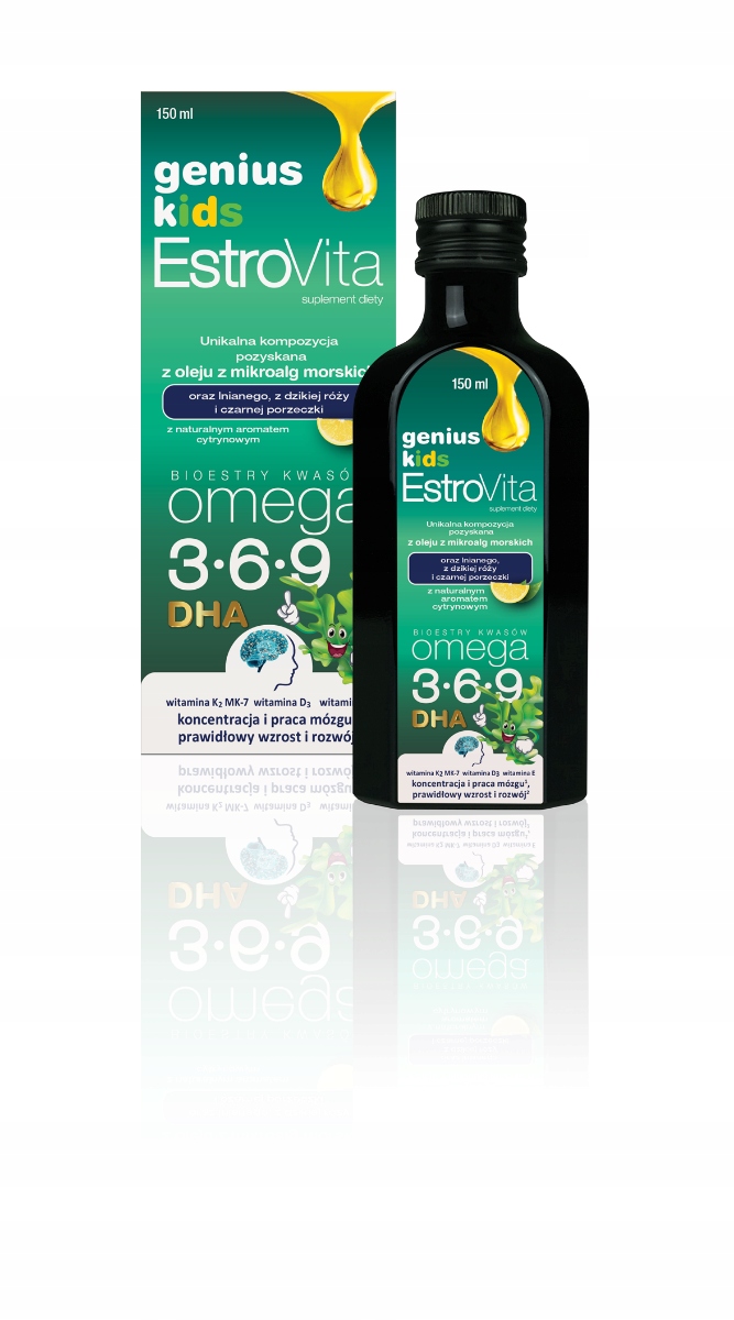 Suplement diety Estrovita Genius Kids to wyjątkowy produkt, który zawiera unikalne połączenie olejów z mikroalg morskich, lnianego, z dzikiej róży i z czarnej porzeczki oraz ekstraktu z rozmarynu. Stanowi on bardzo dobre źródło kwasów omega-3, omega-6, omega-9, a także witamin E, D i K. Preparat ten dedykowany jest dzieciom do trzeciego roku życia. Nie zawiera on sztucznych dodatków ani żadnych substancji pochodzenia zwierzęcego.