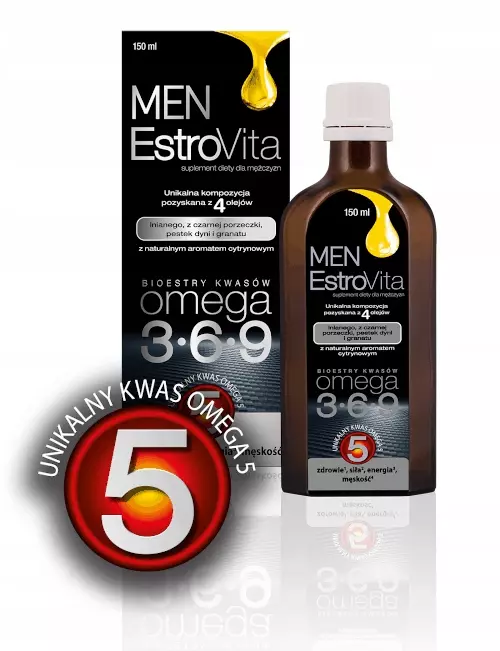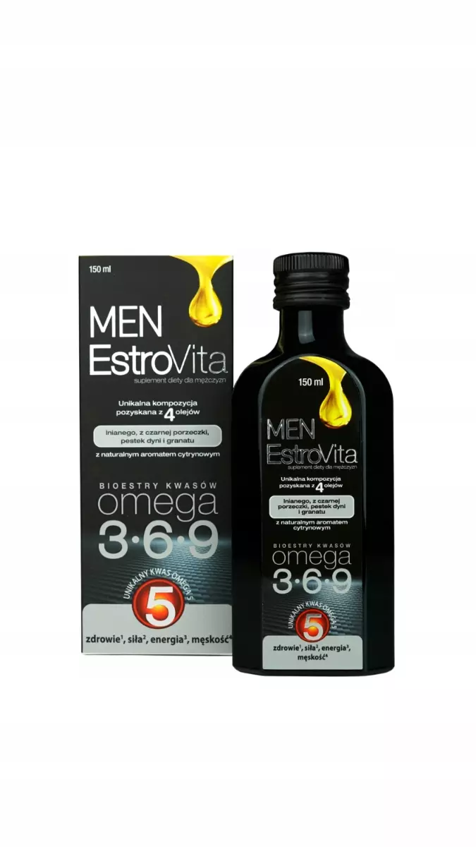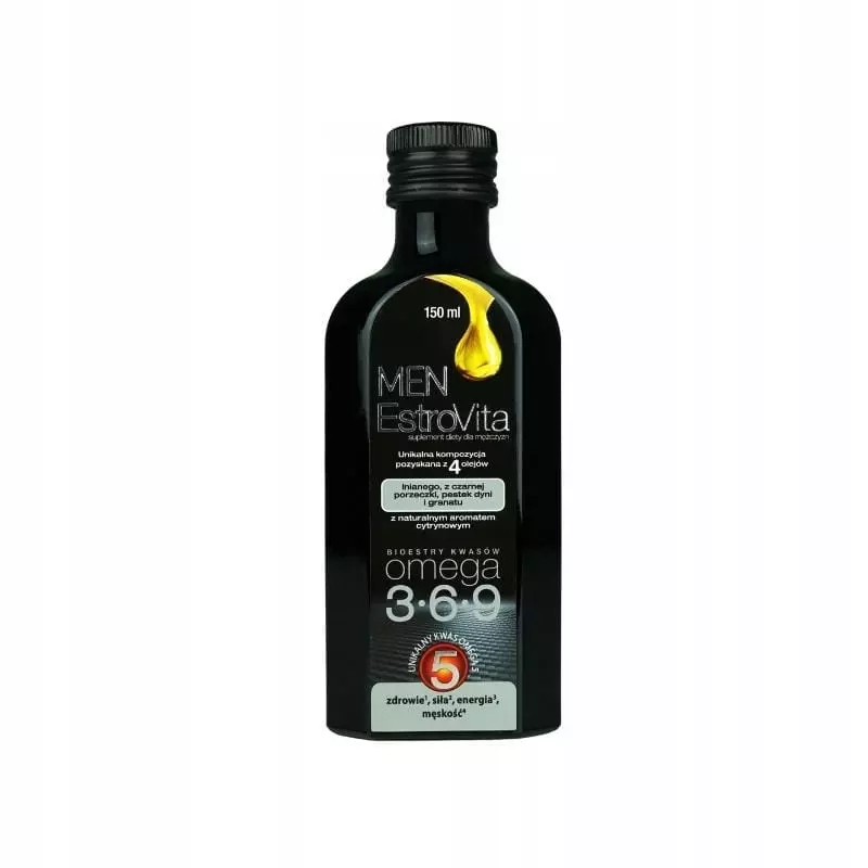 Suplement diety EstroVita MEN, Omega 3-6-9 150ml to produkt zawierający kwasy tłuszczowe omega-3,-6,-9 w idealnych proporcjach. Pozyskiwane są z opatentowanej formuły i mieszaniny czterech olejów roślinnych: lnianego, czarnej porzeczki, pestek dyni i granatu.