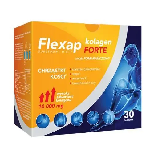 Suplement diety Flexap Kolagen FORTE smak pomarańczowy to połączenie 5 składników aktywnych w jednej saszetce. Polecany w celu uzupełnienia diety w kolagen, glukozaminę (w postaci siarczanu), kwas hialuronowy, witaminę C oraz wapń.