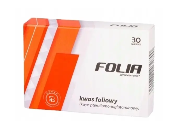 Folia - to suplement diety w postaci kapsułek, który zawiera w swoim składzie kwas foliowy. Produkt przeznaczony dla kobiet w ciąży i planujących ciąże. Kwas foliowy - pomaga w: prawidłowym wzroście tkanek matczynych podczas ciąży, prawidłowej syntezie aminokwasów, prawidłowej produkcji krwi, utrzymaniu prawidłowego metabolizmu homocysteiny, utrzymaniu prawidłowych funkcji psychologicznych, prawidłowym funkcjonowaniu układu odpornościowego, zmniejszeniu uczucia zmęczeni i znużenia. Wspiera proces podziału komórek. Składniki Substancja wypełniająca (celuloza mikrokrystaliczna), skrobia ziemniaczana, substancja przeciwzbrylająca (sól magnezowa kwasu tłuszczowego - stearynian magnezu), substancja utrzymująca wilgoć (dwutlenek krzemu), kwas foliowy (kwas pteroilomonoglutaminowy). Składnik Dzienna porcja (1 tabletka) %RWS* Kwas foliowy (kwas pteroilomonoglutaminowy) 400 µg 200 *Referencyjna Wartość Spożycia Dawkowanie Kobiety w ciąży i planujące ciąże: 1 tabletka dziennie. W planowanym macierzyństwie powinno stosować się preparat co najmniej 1 miesiąc przed poczęciem dziecka. Przeciwwskazania Nie stosować w przypadku nadwrażliwości na którykolwiek ze składników preparatu. Nie należy przekraczać zalecanej porcji do spożycia w ciągu dnia. Preparat jest suplementem diety, nie może być stosowany jako substytut (zamiennik) zróżnicowanej diety. Zalecany jest zrównoważony sposób żywienia i zdrowy tryb życia. Przechowywanie Przechowywać w suchym miejscu. Chronić od światła i wilgoci. Przechowywać w temperaturze nie przekraczającej 25°C. Przechowywać w sposób niedostępny dla małych dzieci.