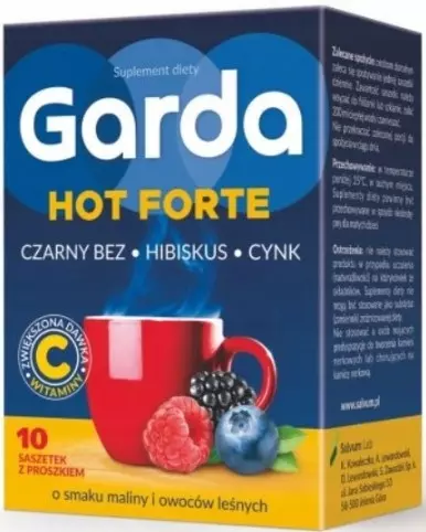 Suplement diety Garda HOT FORTE zawiera wysoką zawartość witaminy C oraz cynku. Dodatkowo jego skład został wzbogacony o ekstrakty z kwiatów czarnego bzu i hibiskusa.