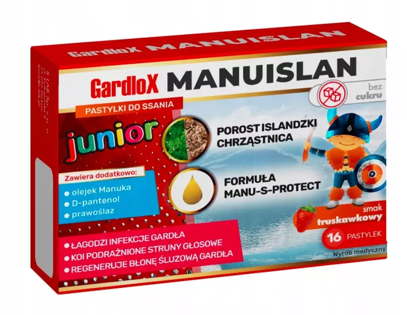 Porost islandzki (Cetraria islandica), chrząstnica kędzierzawa (Chondrus crispus), prawoślaz (Althea officianlis), D-pantenol, formuła Manu-S-Protect (zawierająca mieszaninę olejków eterycznych: Manuka, z drzewa herbacianego, cedrowy, lemonograsowy, lawendowy i tymiankowy ), witamina C, mentol, proszek truskawkowy (naturalny aromat truskawkowy, zagęszczony sok truskawkowy, maltodekstryna), ksylitol, kwas cytrynowy, izomalt, glikozydy stewiolowe, woda.