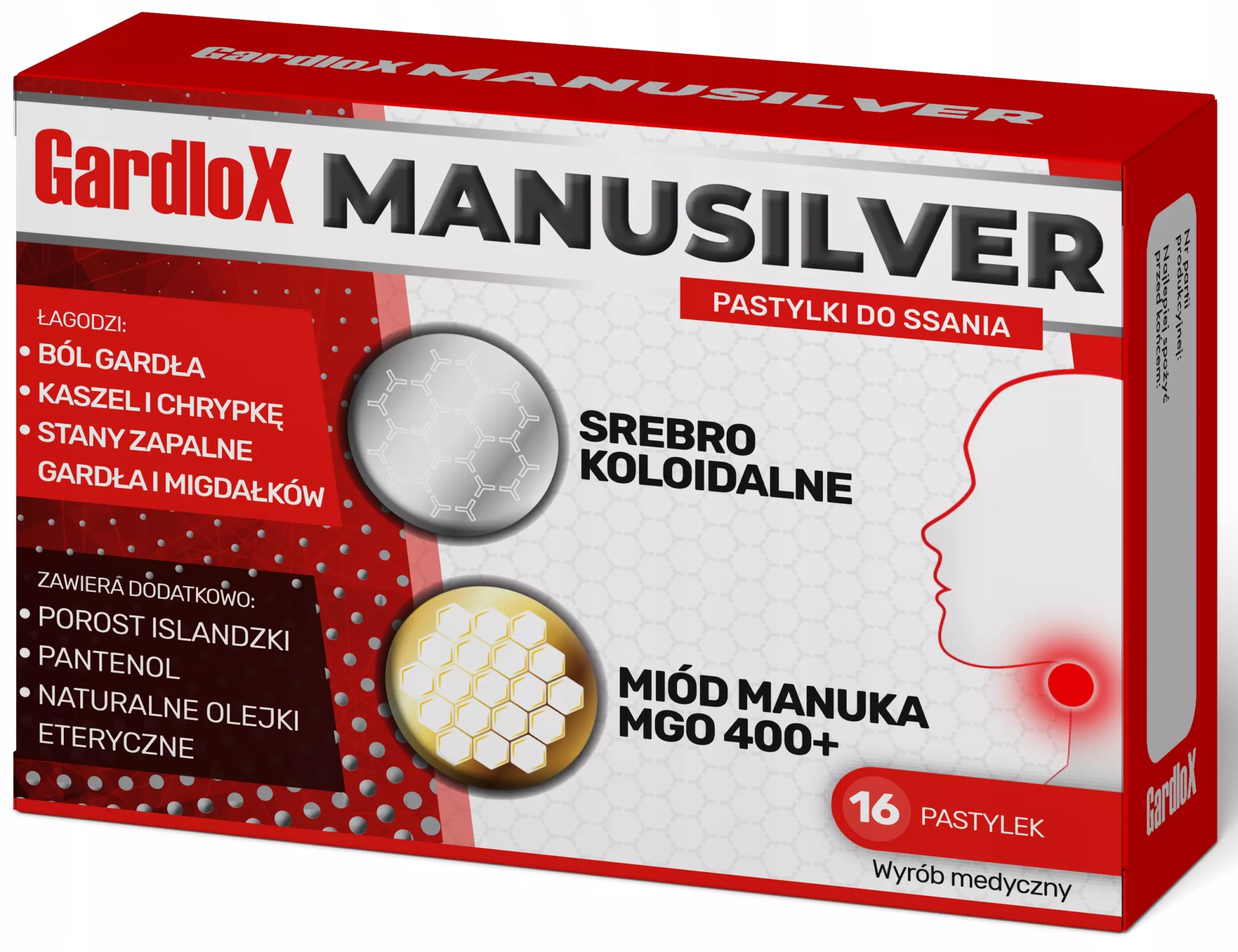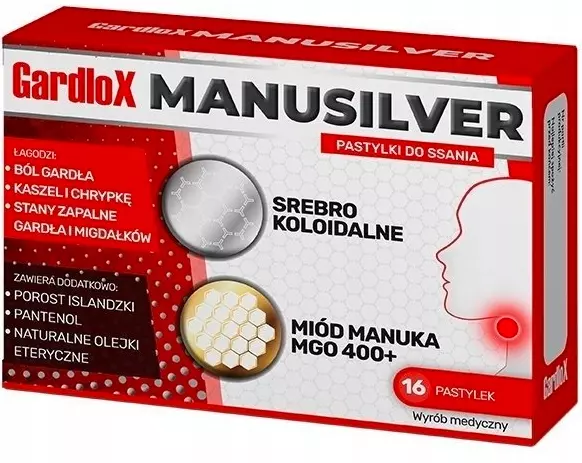 Pastylki do ssania zawierające innowacyjne połączenie srebra nanokoloidalnego, miodu Manuka oraz sześciu dodatkowych składników aktywnych stosowane celem łagodzenia bólu i podrażnień gardła, stanów zapalnych gardła i migdałków, chrypki i kaszlu.