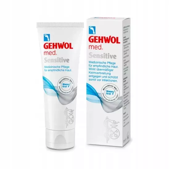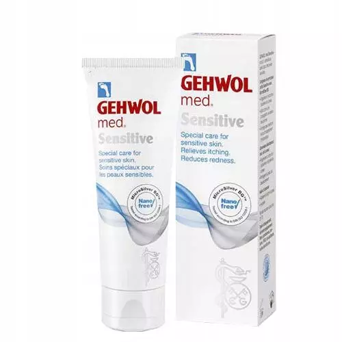 Medyczna seria marki GEHWOL oznaczona jest na produktach skrótem "med". Krem do pielęgnacji skóry wrażliwej z mikrosrebrem jest jednym z ciekawszych produktów serii, jest bardzo skutecznym preparatem dla skór delikatnych ze skłonnościami do podrażnień. Zawiera czynny kompleks substancji z Mikrosrebrem BG, który regeneruje naturalną mikroflorę skóry, łagodzi swędzenie i pieczenie, a także zmniejsza już powstałe zaczerwieniania. Pielęgnacja przy użyciu tego aktywnego preparatu zapobiega nadmiernemu rozprzestrzenianiu się zarazków i chroni tym samym przed zakażeniami. Ceramidy jakie zawiera krem usprawniają naturalne funkcje skóry, regenerują funkcję ochronną skóry i zabezpieczają przed jej wysuszeniem. Łagodny olejek migdałowy działa kojąco na skórę, pielęgnuje ją i nawilża. Przebadany klinicznie jako preparat z serii medycznej marki GEHWOL. Nadaje się również do terapii towarzyszącej przy cukrzycy, atopowym zapaleniu skóry oraz grzybicy stóp i paznokci. Wskazany dla diabetyków.