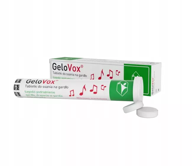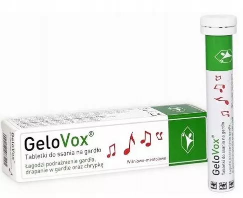 Stosowanie: W zależności od potrzeb GeloVox można stosować kilka razy dziennie, np. co 2 – 3 godziny ssać jedną tabletkę GeloVox®. Można stosować do 6 tabletek do ssania dziennie. Zaleca się stosowanie preparatu po posiłku. Tabletki do ssania GeloVox należy ssać powoli do momentu całkowitego rozpuszczenia, aby kompleks hydrożelowy uległ dokładnemu rozprowadzeniu na błonach śluzowych. Tabletek do ssania nie należy rozgryzać ani połykać w całości.
