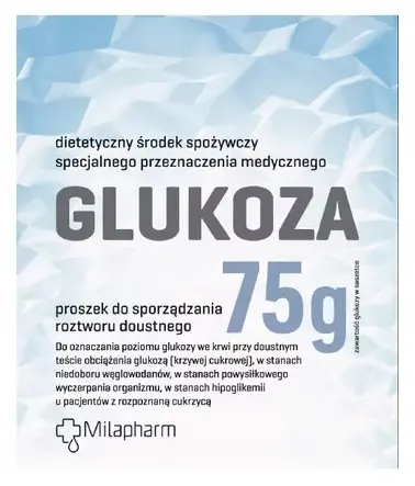 dietetyczny środek spożywczy specjalnego przeznaczenia medycznego Do postępowania dietetycznego w celu wykonania doustnego testu tolerancji glukozy (krzywej cukrowej), w stanach niedoboru węglowodanów, stanach wyczerpania po długotrwałym wysiłku fizycznym. 1 saszetka zawiera 75 g glukozy Sposób użycia: Doustny test tolerancji glukozy: po wykonaniu oznaczenia glukozy we krwi na czczo, 75 g glukozy (cała saszetka) rozpuścić w szklance wody (200-300 ml), roztwór wypić w ciągu 3-5 minut; następne oznaczenie glukozy wykonuje się po 120 minutach W stanach wyczerpania, po wysiłku fizycznym: można przyjąć od 5 g do 20 g (łyżeczka do kliku łyżeczek) glukozy. Zalecana dzienna porcja: 1 saszetka (75 g) Składniki: Glukoza Ostrzeżenie: Nie należy przekraczać zalecanej dziennej porcji do spożycia. Nie stosować pozajelitowo. Nie stosować w zespole złego wchłaniania glukozy. Nie stosować produktu jeśli kiedykolwiek wcześniej wystąpiła nadwrażliwość na którykolwiek z jego składników. Produkt przyjmowany pod nadzorem lekarza, doustnie. Może stanowić zagrożenie dla zdrowia, jeśli jest spożywany przez osoby u których nie stwierdzono określonej choroby, zaburzeń stanu zdrowia lub brak jest wskazań lekarskich wynikających z przeznaczenia produktu Przeciwskazania: Nadwrażliwość na którykolwiek składnik preparatu. Kobiety w ciąży i karmiące piersią przed zastosowaniem produktu powinny skonsultować się z lekarzem Producent: MILAPHARM Sp. z o.o., pl. Gen. Józefa Hallera 5/14A, 03-464 Warszawa.