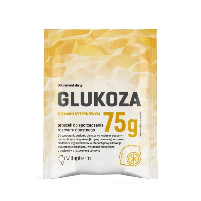 Milapharm Glukoza o smaku cytrynowym jest suplementem diety, pozwalającym w szybki sposób przygotować porcję roztworu glukozowego. Składniki: Glukoza Masa netto: 75 g Właściwości i przeznaczenie: Do postępowania dietetycznego w celu wykonania doustnego testu tolerancji glukozy (krzywej cukrowej), w stanach niedoboru węglowodanów, stanach wyczerpania po długotrwałym wysiłku fizycznym. Zalecane dzienne spożycie: Doustny test tolerancji glukozy: po wykonaniu oznaczenia glukozy we krwi na czczo, 75 g glukozy (cała saszetka) rozpuścić w szklance wody (200-300 ml), roztwór wypić w ciągu 3-5 minut; następne oznaczenie glukozy wykonuje się po 120 minutach W stanach wyczerpania, po wysiłku fizycznym: można przyjąć od 5g do 20 g (łyżeczka do kliku łyżeczek) glukozy. Przeciwwskazania: Nie stosować w przypadku uczulenia na danych składnik zawarty w produkcie. Przechowywanie: Przechowywać w szczelnie zamkniętym opakowaniu w temperaturze do 25C. Producent: Milapharm Sp. z o.o. Plac Gen. J. Hallera 5/14a 03-464 Warszawa Ważne informacje: Suplement diety nie może być stosowany jak substytut (zamiennik) zróżnicowanej diety. Nie należy przekraczać zalecanej dziennej porcji. Zrównoważony sposób żywienia i prawidłowy tryb życia jest ważny dla funkcjonowania organizmu człowieka. Przechowywać w miejscu niedostępnym dla małych dzieci. Nie należy stosować preparatu w przypadku nadwrażliwości na którykolwiek składnik preparatu.