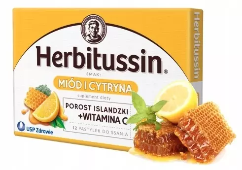 USP Zdrowie jest liderem na rynku produktów i leków dostępnych bez recepty w Polsce. Herbitussin Porost Islandzki + Wit. C  to suplement diety w postaci pastylek do ssania przeznaczony dla dzieci od 6. roku życia i dla osób dorosłych. Wskazany do stosowania wspomagającego w infekcjach górnych dróg oddechowych, suchości gardła oraz w jego podrażnieniu czy podrażnieniu krtani. Pastylki działają łagodząco na ból gardła i krtani oraz stanowią wsparcie dla efektywnego działania układu odpornościowego.