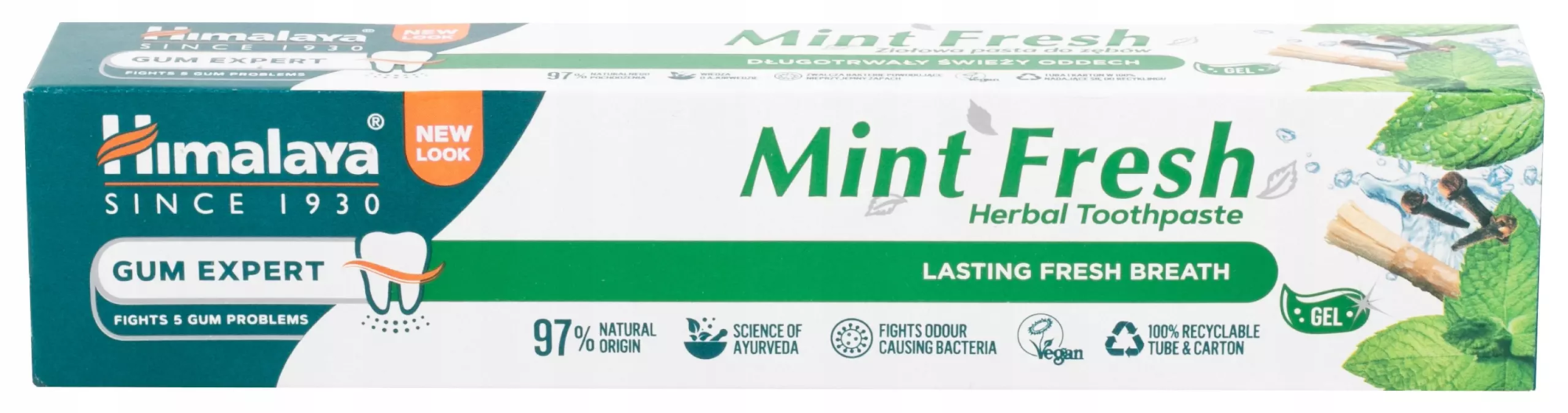 Gum Expert - Mint Fresh Herbal Toothpaste marki Himalaya. Pasta do zębów. Jest w 100% wegetariańska i nie zawiera w sobie fluoru. Posiada żelową formułę, na bazie specjalnie wyselekcjonowanych aktywnych składników: korzenia drzewa arakowego (miswak), ekstrakt z goździków raz mięty i kopru indyjskiego. Długotrwale odświeża oddech, dokładnie myje i oczyszcza, wzmacnia dziąsła oraz zapobiega ich krwawieniu, a także chroni przed stanami zapalnymi. Pasta dostępna jest w tubce o pojemności 75 ml.