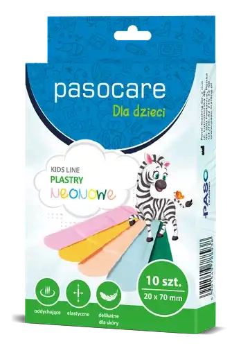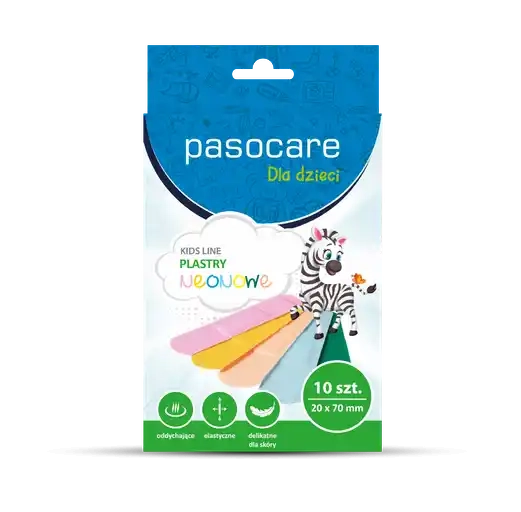 Hypoallergeniczne plastry neonowe dla dzieci są idealnym rozwiązaniem dla małych skaleczeń i zadrapań. Zapewniają one skuteczną ochronę i nie powodują uczuleń. Plastry dostępne są w pięciu jaskrawych kolorach, które z pewnością przypadną do gustu najmłodszym użytkownikom. Ich mikroperforowana konstrukcja umożliwia skórze oddychanie, co przyspiesza proces gojenia. Dzięki swojej elastyczności świadczą o dużym dopasowaniu do kształtu ciała, zapewniając maksymalny komfort podczas noszenia. Delikatne dla wrażliwej skóry dziecka, te plastry hipoalergiczne są dodatkowym atutem. W opakowaniu znajduje się 10 sztuk plastrów o wymiarach 20*70 (mm x mm). Są one łatwe w użyciu - wystarczy wyciągnąć plaster z opakowania i nałożyć na czystą i suchą skórę, kierując bezpośrednio na ranę. Plastry można bezpiecznie usunąć, chwytając za krawędź i delikatnie odklejając. Zalecamy codzienne zmienianie plastra w celu utrzymania higieny. Plastry neonowe dla dzieci PasoCare NEONOWE KIDS LINE to produkt medyczny z oznakowaniem CE i deklaracją zgodności UE. Przeznaczone dla jednorazowego użytku, są sterylne i nie powinny być stosowane na rany silnie sączące.