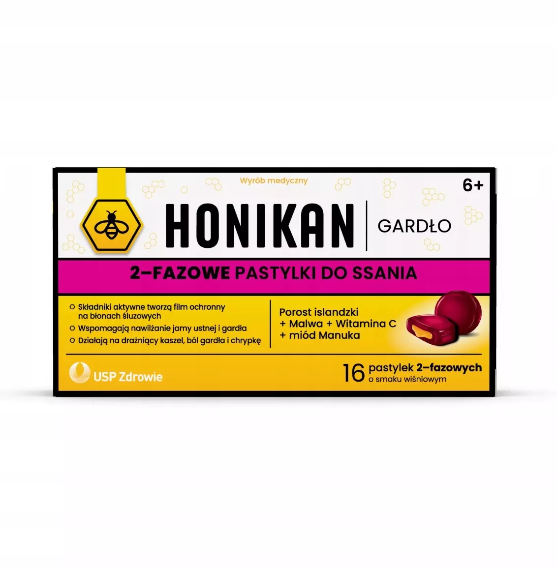 - HONIKAN GARDŁO 2-FAZOWE PASTYLKI DO SSANIA wskazane są w terapii drażniącego kaszlu, bólu gardła i chrypki (np. przy przeziębieniu) oraz wspomagają naturalne nawilżanie błony śluzowej jamy ustnej i gardła.