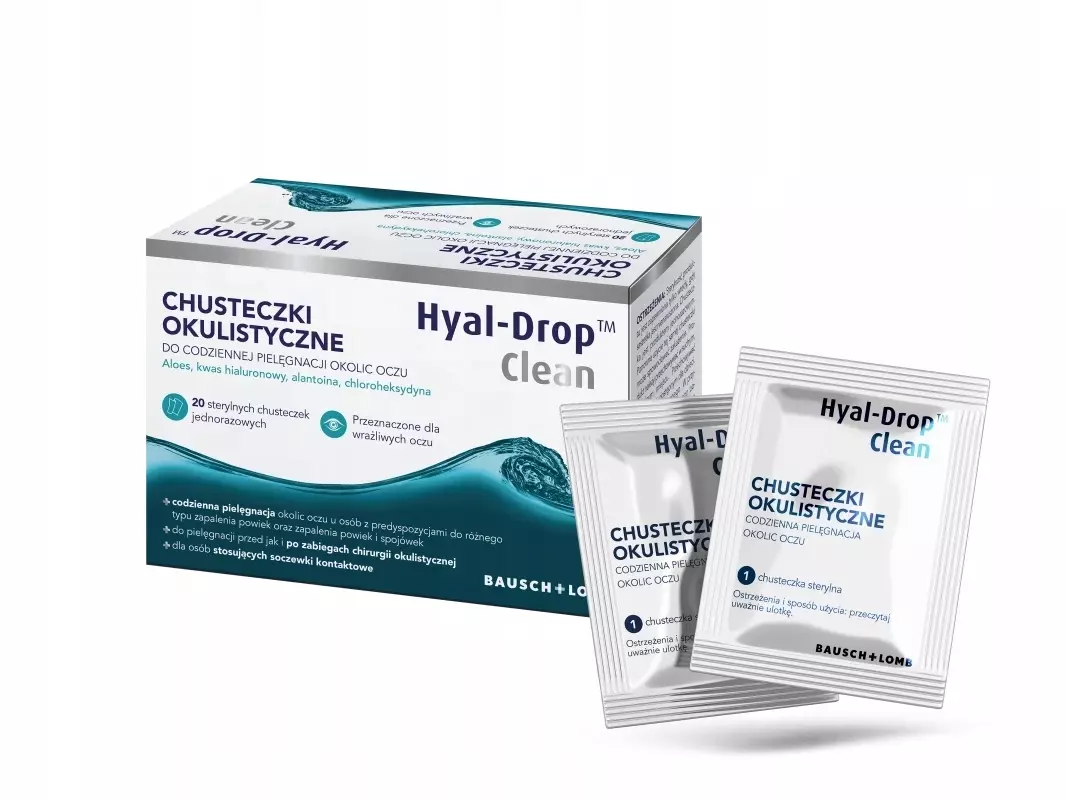 Chusteczki Hyal-Drop Clean przeznaczone są do miejscowej pielęgnacji powiek i rzęs u dorosłych i dzieci powyżej 3 roku życia.