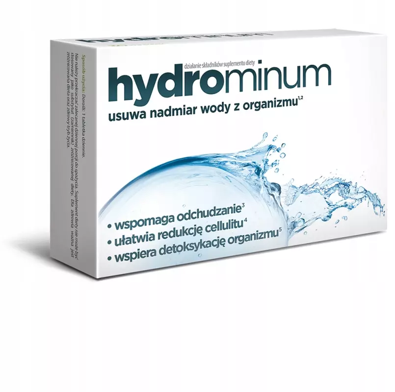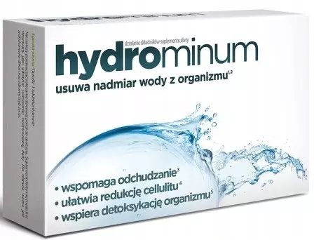 Hydrominum suplement diety zawiera naturalne składniki wspomagające eliminację wody z organizmu oraz fizjologiczną detoksykację.