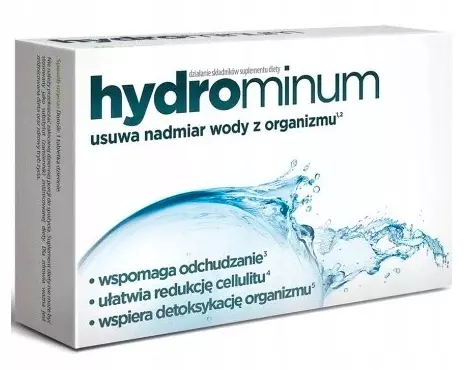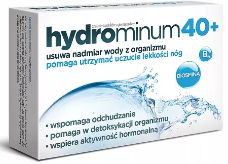 Hydrominum 40+ to suplement diety, który w trosce o kobiety po 40 roku życia został wzbogacony o jeszcze więcej naturalnych składników, wspomagających eliminację wody z organizmu takich jak, wyciąg z liści brzozy i kłącza perzu. Zawiera diosminę i wyciąg z ruszczyka kolczastego, który wspiera prawidłowe krążenie żylne i zdrowie nóg pomagając utrzymać uczucie ich lekkości. Witamina B6 przyczynia się do regulacji aktywności hormonalnej i wsparcia prawidłowych funkcji psychologicznych. Składniki produktu wspomagają naturalne procesy oczyszczania i fizjologicznej detoksykacji organizmu (wyciąg z mniszka lekarskiego), wspierają odchudzanie (wyciąg z zielonej herbaty) i ułatwiają redukcję cellulitu (wyciąg z nasion winogron).