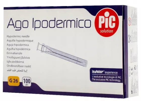 PIC igła 0,45x12,7mm G26 iniekcyjna – sterylna, apirogenna igła jednorazowego użytku, dostępna w pojedynczych, odrywanych blistrach. Nasadka typu Luer Lock. Wyjątkowo cienkie i gładkie ścianki.