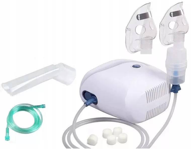 - Akcesoria w zestawie: maseczka dla dorosłych i dla dzieci, rozpylacz, przewód powietrza, ustnik, 5x filtr powietrza