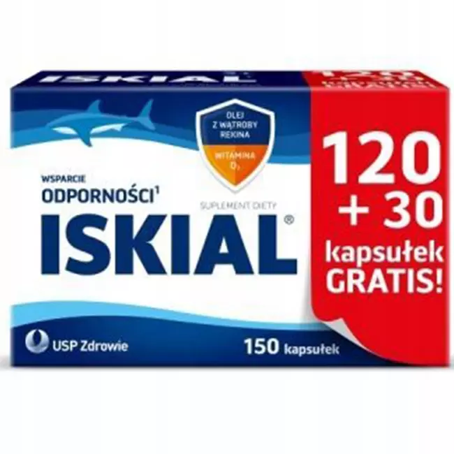 Iskial olej z wątroby rekina jest suplementem diety w postaci 150 kapsułek. Zawiera w swoim składzie olej z wątroby rekina i witaminę D. Preparat stosowany jest podczas osłabionego organizmu i obniżonej odporności. Wskazany jest dla osób uprawiających sport i aktywnych fizycznie. Polecany w celu wspomagania prawidłowego wzrostu i rozwoju kości. Produkt wspiera i wzmacnia naturalną odporność organizmu. Dba o zdrowie zębów i kości oraz wspiera prawidłowe funkcjonowanie mięśni. Olej z wątroby rekina jest niezbędnym składnikiem do prawidłowego wzrostu i rozwoju kości u dzieci. Przeznaczony dla dzieci od 3 roku życia i osób dorosłych.