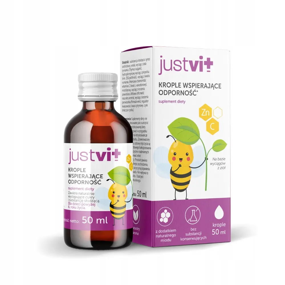 Suplement diety Krople wspiarające odporność zawira skłądniki: witaminę C, cynk i dodatek ziół pomagających w prawidłowym funkcjonowaniu układu odpornościowego. Wyciąg z korzenia prawoślazu i korzenia pierwiosnka wspomagają zdrowie układu oddechowego.