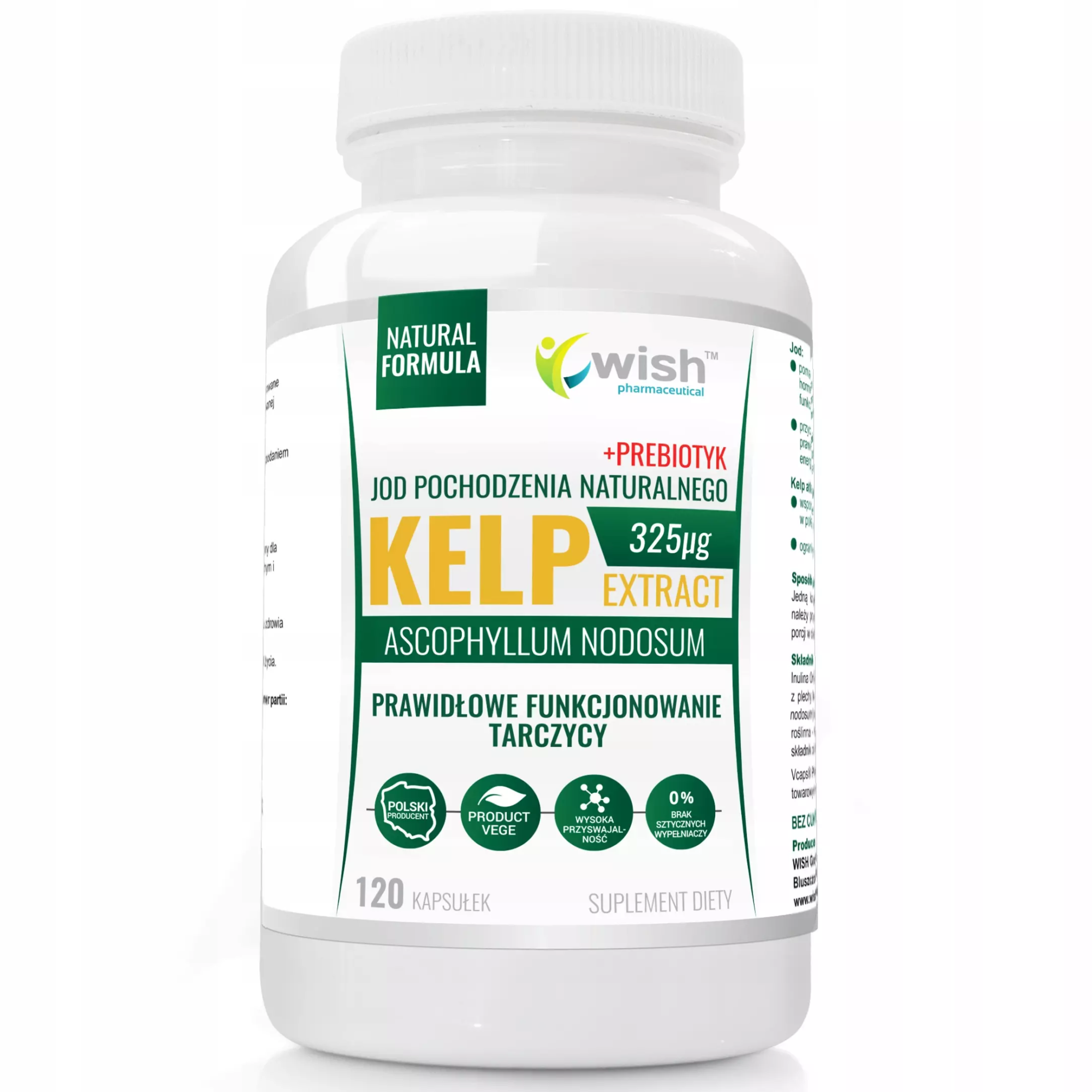120 dni suplementacji. Innowacyjna receptura - nowoczesna formuła wyróżniająca się wśród inny produktów pod względem swojego składu. Vcaps® - kapsułki wykonane z półsyntetycznej hypromelozy, pozwalają na kontrolowanym uwalnianiu się substancji aktywnych przez co nie podrażniają żołądka. Brak sztucznych wypełniaczy - w składzie kapsułki nie występują substancje takie jak: sole magnezowe kwasów tłuszczowych (stearynian magnezu), wodorofosforan wapnia, ditlenek krzemu, celuloza mikrokrystaliczna. Polecana osobom - intensywnie trenującym sport, pracującym fizycznie, żyjącym w zanieczyszczonym środowisku. Produkt odpowiedni: dla wegan i wegetarian. 100% bezpieczny - bez skrobi, bez soli, bez cukru, nie zawiera glutenu, jaj, soi, białka mleka i laktozy WISH KELP 325mcg NATURALNY JOD + PREBIOTYK 120kaps KELP określa grupę wodorostów o charakterystycznym brązowo-zielonym zabarwieniu, której cechą wspólną jest szczególne bogactwo zawartego w nim jodu. KELP ATLANTYCKI - wspomaga redukcję masy ciała w połączeniu z odpowiednią dietą ogranicza przyswajanie tłuszczów JOD - pomaga w prawidłowej produkcji hormonów tarczycy i w prawidłowym funkcjonowaniu tarczycy przyczynia się do utrzymania prawidłowego metabolizmu energetycznego