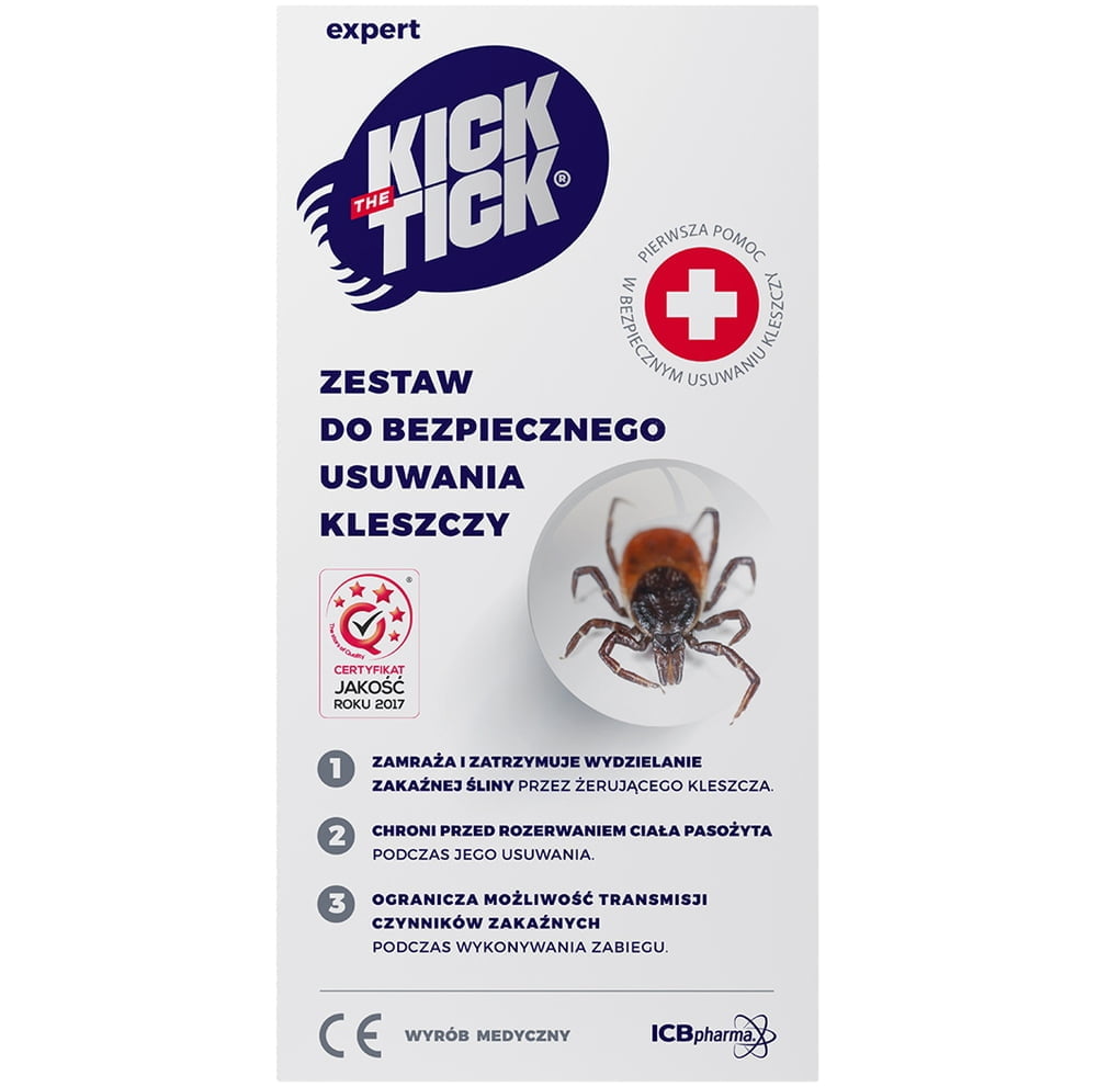 KICK THE TICK Expert to zestaw do bezpiecznego usuwania kleszczy przyczepionych do skóry ludzi i zwierząt. Został zaprojektowany z myślą o różnych rozmiarach kleszczy – 2 różniące się wielkością końcówki służą odpowiednio do usuwania larw/nimf oraz okazów dorosłych. Zastosowanie przyrządu ułatwia samodzielne usunięcie kleszcza i ogranicza możliwość transmisji czynników zakaźnych podczas wykonywania zabiegu