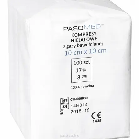 PASO-TRADING - PASOMED, kompresy niejałowe, 17-nitkowe, 8-wartwowe (10cmx10cm), są przeznaczone do opatrywania ran jako bariera mechaniczna.