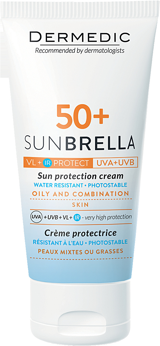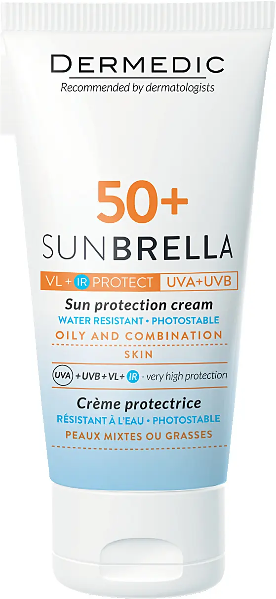 Krem ochronny SPF 50+ Dermedic Sunbrella do skóry z problemami naczyniowymi działa ochronnie na skórę. Wykazuje działanie ochronne DNA komórek skóry. Krem uszczelnia i zmniejsza kruchość naczyń krwionośnych. Posiada działanie przeciwrumieniowe i przeciwzakrzepowe