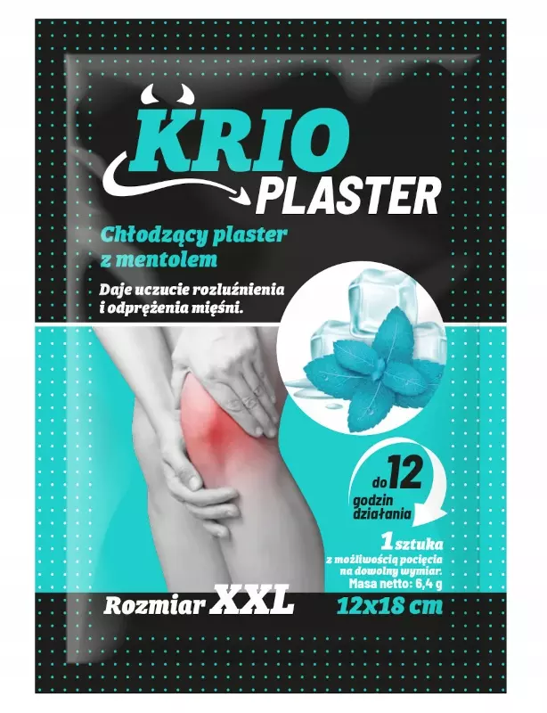Krio Plaster zawarty w nim mentol, poprzez swoje chłodzące działanie, zmniejsza obrzęki pourazowe oraz działa kojąco w bólach stawowo-mięśniowych m.in. barków, pleców i karku.