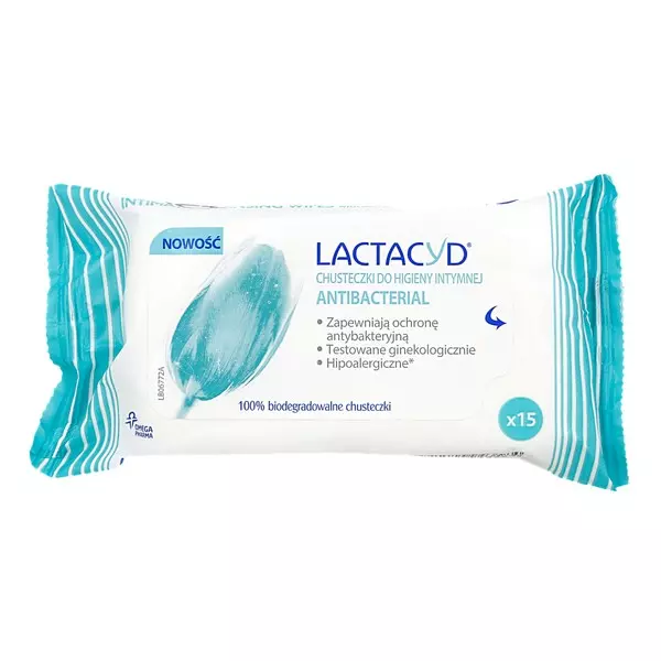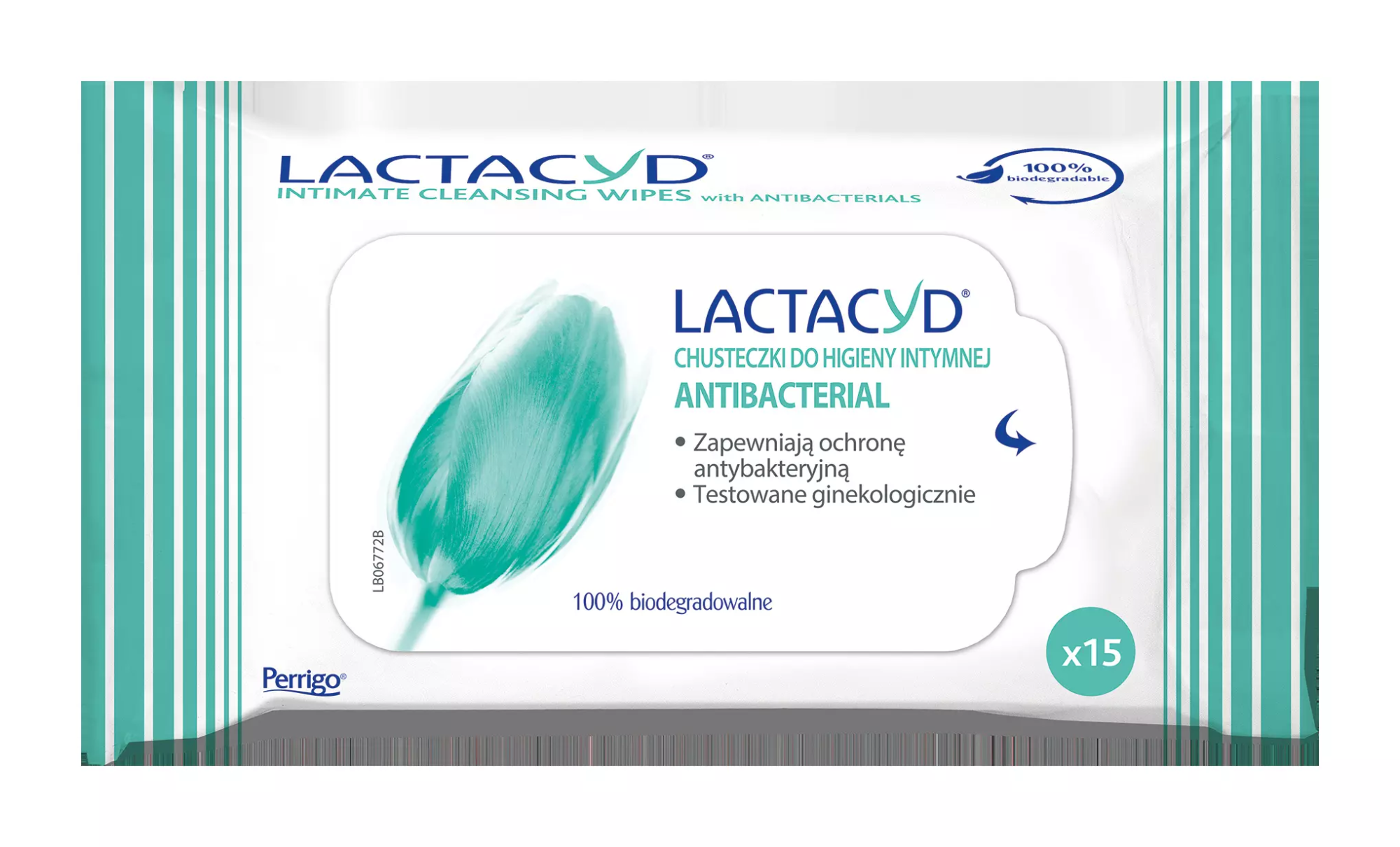 Lactacyd Antibacterial chusteczki do higieny intymnej, produkt dedykowany do stosowania w pracy, podróży. Produkt zapewnia ochronę antybakteryjną. W 100% biodegradowalne. Testowane ginekologicznie.