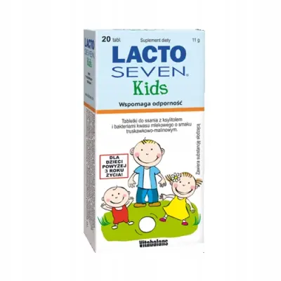 Lacto Seven Kids dedykowany dzieciom probiotyk w formie tabletki do ssania z ksylitolem o pysznym truskawkowo-malinowym smaku. Stosowany w trakcie: antybiotykoterapii, podróży i biegunki.