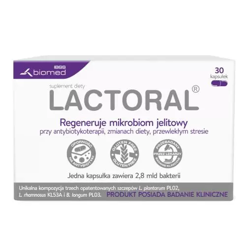 LACTORAL® jest suplementem diety zawierającym wyselekcjonowane szczepy żywych bakterii kwasu mlekowego: Lactobacillus plantarum PL02, Lactobacillus rhamnosus, KL53A, Bifidobacterium longum PL03 do stosowania w celu utrzymania równowagi mikroflory jelitowej.