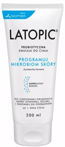 Latopic® Probiotyczna emulsja do ciała kompleksowo pielęgnuje, chroni i odżywia skórę atopową, suchą i skłonną do podrażnień. Dzięki bogatej formule skutecznie nawilża i natłuszcza, szybko łagodzi świąd oraz regeneruje. Latopic® Probiotyczna emulsja do ciała zawiera w swoim składzie metabolity Lactobacillus sp., które w naturalny sposób działają przeciwdrobnoustrojowo, pomagają zapobiegać rozwojowi Staphylococcus aureus, który może zaostrzać objawy skórne u osób ze skórą atopową. Przeznaczona jest do codziennej pielęgnacji skóry niemowląt, dzieci i osób dorosłych.