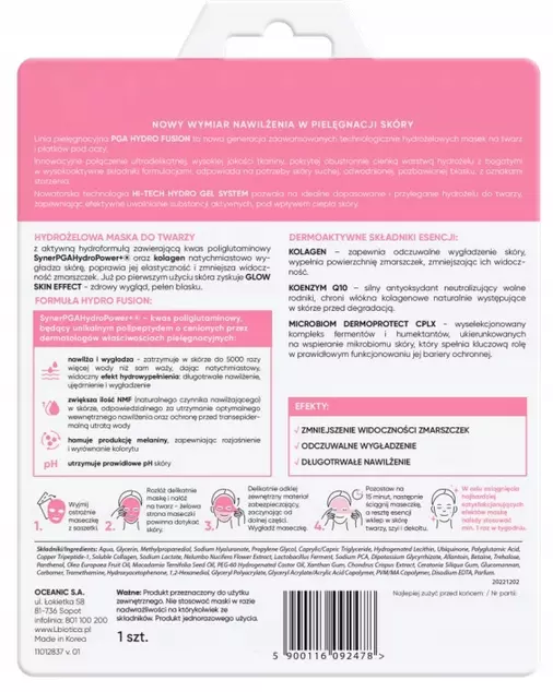 Hydrożelowa maska do twarzy z linii PGA Hydro Fusion z aktywną hydroformułą zawierającą kwas poliglutaminowy SynerPGAHydroPower+® oraz kolagen i koenzym Q10. Już po pierwszym użyciu skóra zyskuje GLOW SKIN EFFECT - zdrowy wygląd, pełen blasku.
