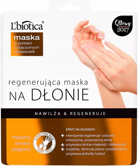 Silnie regenerująca MASKA NA DŁONIE, w postaci nasączonych rękawiczek, to profesjonalny zabieg do samodzielnego wykonania w domu.EFEKT NA DŁONIACH:- intensywnie regeneruje i odżywia zniszczoną, przesuszoną skórę- przywraca skórze gładkość i delikatność- rozjaśnia, eliminuje plamy i przebarwienia, przywraca jednolity kolorytBogactwo w naturalne składniki takie jak masło Shea, olej jojoba, miód oraz olej sezamowy sprawia, że maska ma silnie działanie regenerujące i kojące, odżywia nawet bardzo przesuszone i spierzchnięte dłonie.Zawarty w masce kolagen oraz kwas hialuronowy nawilżają skórę dłoni, przywracają jej miękkość i delikatność. Ekstrakt z Portulaca oleracea oraz rumianku sprawia, że skóra zyskuje jednolity koloryt.Dzięki nowoczesnej technologii substancje aktywne zawarte w masce są doskonale wchłaniane i wnikają nawet w głębokie warstwy skóry. Maska w postaci rękawiczek spełnia rolę filtra, który w połączeniu z ciepłotą ciała stopniowo uwalnia aktywne składniki i pomaga wnikać im w głębokie warstwy skóry.Efekt widoczny już po pierwszym użyciu- skóra dłoni jest widocznie zregenerowana, nawilżona i jedwabiście gładka. Maska, na bazie intensywnie nawilżających składników sprawia, że dłonie stają się aksamitnie gładkie, zregenerowane, bez podrażnień i przebarwień.Dla uzyskania trwałych efektów zabieg należy powtarzać 1-2 razy w tygodniu.Sposób użycia:Dokładnie umyj i osusz dłonie.Otwórz opakowanie i nałóż maskę – rękawicę odpowiednio na prawą i lewą dłoń. Aby wzmocnić działanie kosmetyku, można założyć dodatkowe bawełniane rękawice.Pozostaw na dłoniach ok. 20-25 minut.Po upływie wskazanego czasu zdejmij maskę z dłoni, nadmiar delikatnie wmasuj. Nie ma potrzeby ponownego mycia rąk.